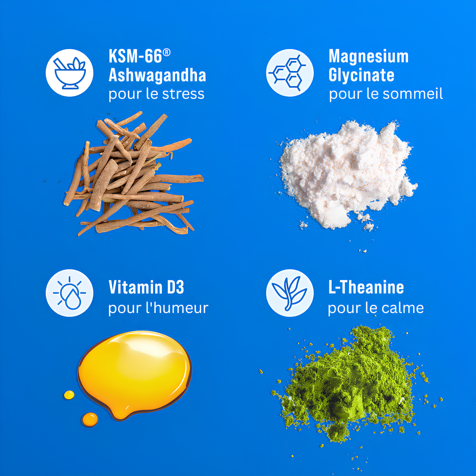 Enrichi en ashwagandha KSM-66®, dont il est scientifiquement prouvé qu'il réduit le niveau de stress.